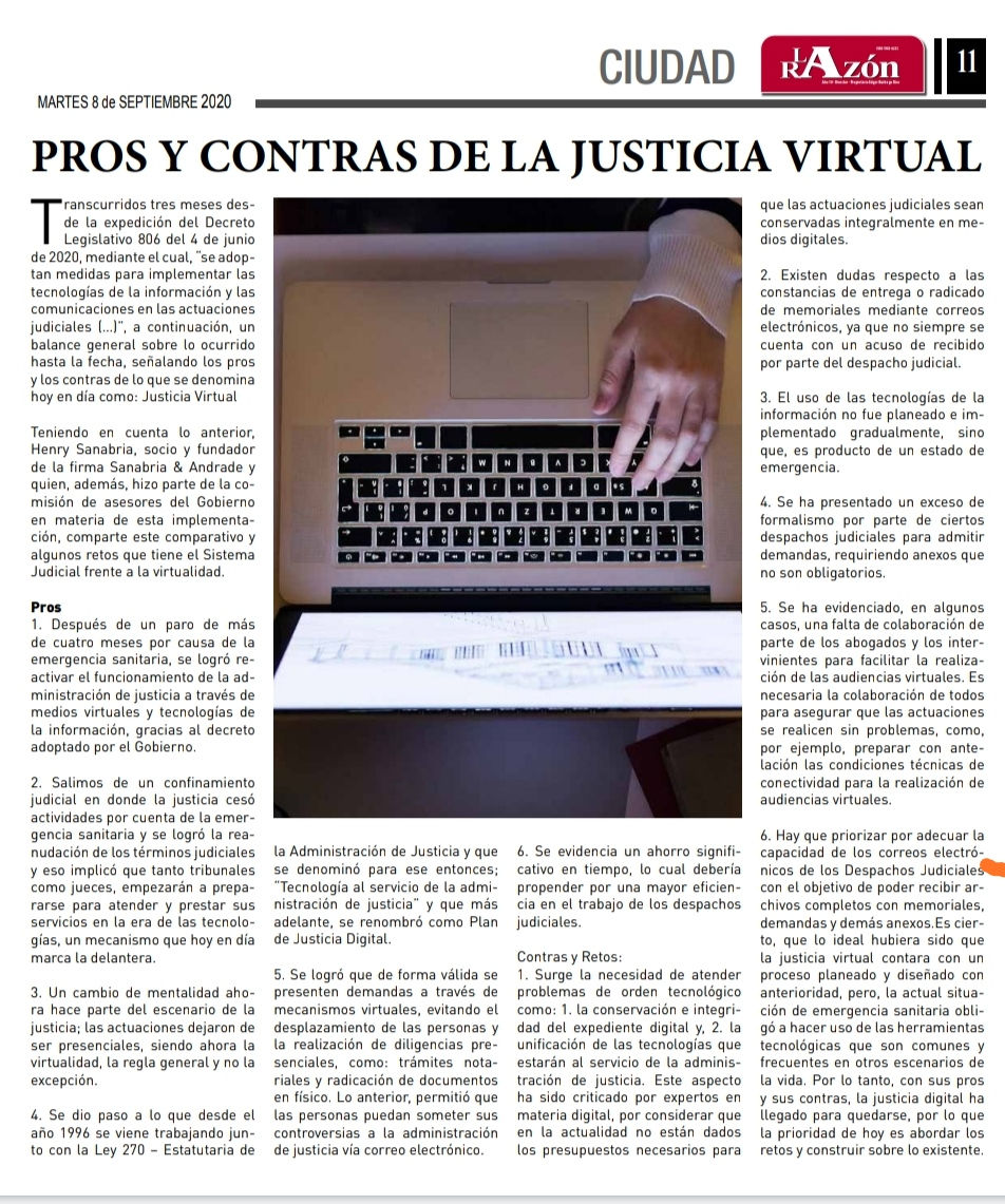Teniendo en cuenta lo anterior, Henry Sanabria, socio y fundador de la firma Sanabria & Andrade y quien, además, hizo parte de la comisión de asesores del Gobierno en materia de esta implementación, comparte este comparativo y algunos retos que tiene el Sistema Judicial frente a la virtualidad.